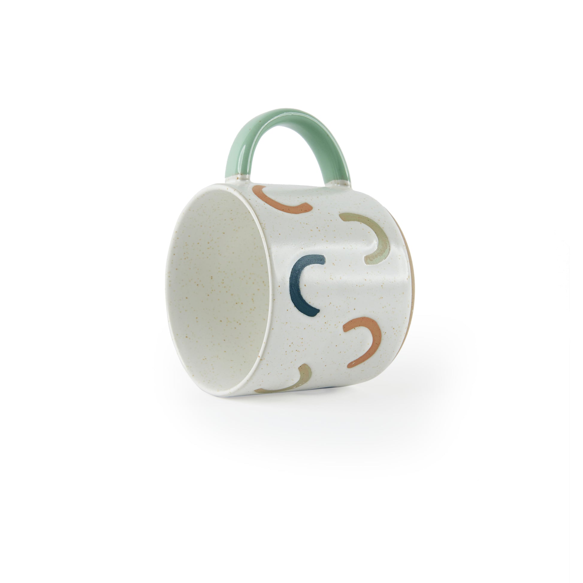 A minimal yet uplifting mug, the ‘Rainbow’ features a lovely blend of muted mini rainbow shapes and is available with a green, pink and navy handle.
